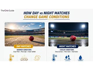 Day vs night matches change pitch behavior, ball movement, and dew impact, with night games often favoring chasing teams due to moisture and easier batting conditions. TheCricGuide provides detailed insights and analysis to help fans better understand these match dynamics.