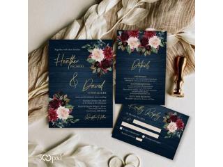 Celebrate your love with this elegant Fall Wedding Invitation Set, featuring burgundy, navy, and blush florals, lush greenery, and a rustic navy wooden background with gold accents. Perfect for autumn weddings, barn venues, and elegant fall ceremonies, this customizable suite beautifully sets the tone for your special day.