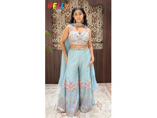 Step into the spotlight with this breathtaking Sky Blue Indo-Western ensemble. This chic three-piece set perfectly balances traditional charm with a modern silhouette, making it an essential for your festive wardrobe.