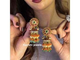 Add grace to your ethnic wardrobe with stunning Kundan Jhumka earrings from Kanshi Jewels. These earrings feature intricate designs, perfect for weddings, festive events, and cultural celebrations. From minimal daily wear to heavy bridal jhumkas, our collection brings together traditional artistry and modern styling. Elevate your look with authentic handcrafted pieces, made with premium-quality materials. Shop online and enjoy hassle-free shipping and secure payments.