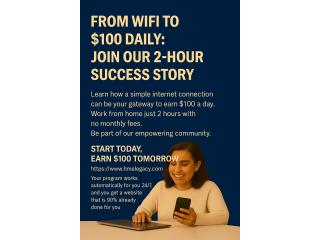 Learn how a simple internet connection can be your gateway to earn $100 a day. Work from home just 2 hours with no monthly fees. Be part of our empowering community. Start your journey today. Start Today, Earn $100 Tomorrow. Your program works automatically for you 24/7, and you get a website that is 90% already done for you