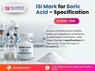 Looking for a trusted BIS Certification agency in Noida to get ISI Mark for Boric Acid? At Silvereye Certifications, we make the entire BIS Certification process easy and hassle-free for you. We help manufacturers and suppliers get certified under IS 10116 : 2015 — the official Indian Standard for Boric Acid. Our expert team takes care of everything from documentation to final approval. Just call us and we will handle the rest for you.